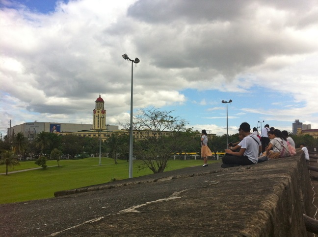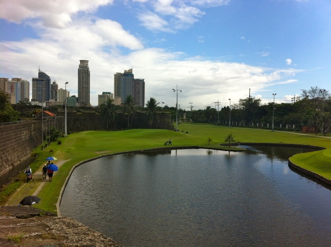 Di hari kedua, kebetulan kakak iparku ada keperluan kerja di Manila, jadi kami semuannya sekalian ikut dan memutuskan untuk jalan-jalan ke Intramuros. Ini adalah bagian kota tua dari Metro Manila (katanya) yang memang menjadi obyek wisata di sana. Selain itu kami juga sempat jalan-jalan ke Makati City (sebuah kota bagian dari Metro Manila) yang banyak daerah perkantoran dan mall-mall kerennya. Berpisah dengan kakak ipar di sebuah mall di daerah Ortigas, the rest of us (my sisters, my niece and me) memilih untuk mencoba naik kereta Metro untuk menuju Intramuros. Metro ini semacam MRT di Singapore, tapi beda kesannya lah ya. Lingkungan di Filipina itu secara visual gak jauh beda dengan Jakarta, dan malah kami sempat harus transit antar jalur/stasiun dan melewati kawasan perumahan agak kumuh di sana. Cuaca di Filipin lagi panas-panasnya dan AC cuma ada kalau kami masuk Metro – di stasiunnya biasa hanya pakai kipas angin. Karena panas, cuek deh pakai baju santai dan lengan buntung di sana. Soal busana kayaknya di Manila sana lebih casual daripada Jakarta sini (apa tergantung kawasannya juga ya)