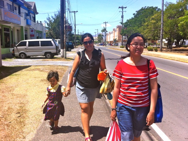 Kali ini para tante makan sarapan di Jolly Bee, chain resto yang kayaknya udah gak hidup di Indonesia ya, tapi di Filipin masih ‘megang’ banget tuh. Oh pilihan menu dan taste makanannya sudah termodifikasi di sana, sesuai selera lokal. Jadi agak ajaib juga nih pilihan dan rasa makanannya. Kalau buat sesekali gapapa sih, lucu dan interesting, tapi kalau terus-terusan sih… Haha, antara bisa bosan atau memang harus adaptasi dengan situasi lokal deh.Usai si kecil pulang sekolah kita balik pakai angkot bus lagi tentunya, dan sore itu sempat keluar jalan-jalan bersama lagi. Kali ini rute jalannya lumayan dibanding hari sebelumnya. Tapi namanya ya ada anak kecil dengan langkah-langkah kecilnya, gak jauh-jauh amat juga sih.