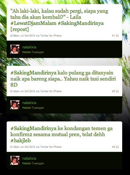 Meski balasan saya cukup standard, tapi kemudian efek lanjutan dari tweet Aryo itu mengusik saya sampai saya membuat ‘serial tweet’ dengan hashtag karangan sendiri: #SakingMandirinya. Ahaha.. iya ini emang lanjutan curcol dengan gaya ironis dan menyindir, meski kemudian bisa juga sih diterjemahkan sebagai self pitying tweets dengan gaya terselubung.. Whichever lah.. karena sesungguhnya ketika itu saya menulisnya dalam kondisi mabuk hormon aka PMS. Iyaaa alesan, tapi biarlah, memang benar juga kok begitu adanya. Tidak perlu dipertanyakan alasan seorang cewek menggalau tengah malam lalu nangis sendiri pas curhat-curhat dalam selubung tweet-tweet menyindir… ya pastilah dewa PMS sedang menyambangi!