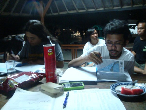 Hari pertama dari trip kami, usailah kami melakukan dua kali diving. Dan malam itu, selain makan malam, menu kami ada tambahannya dong: ujian teori! Haha.. iya, namanya juga dive trip sekalian ujian, jadilah kami harus menyelesaikan soal-soal dengan manual, ditulis di kertas. Ada ambang bawah nilai kelulusan tes, yang lumayan membebani pikiran. Kalau gak lulus, rugi dong bayar mahal-mahal untuk diving course? Memang masih boleh ikut diving di hari Minggu sih, tapi license-nya gak dapat.. sayang banget kan..