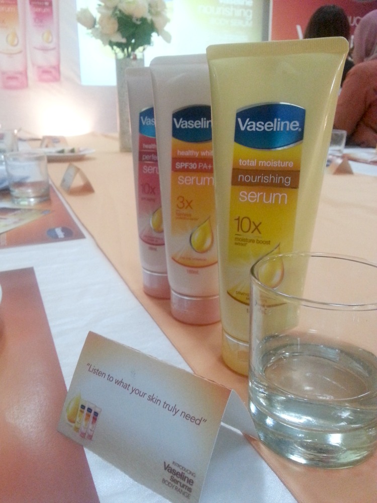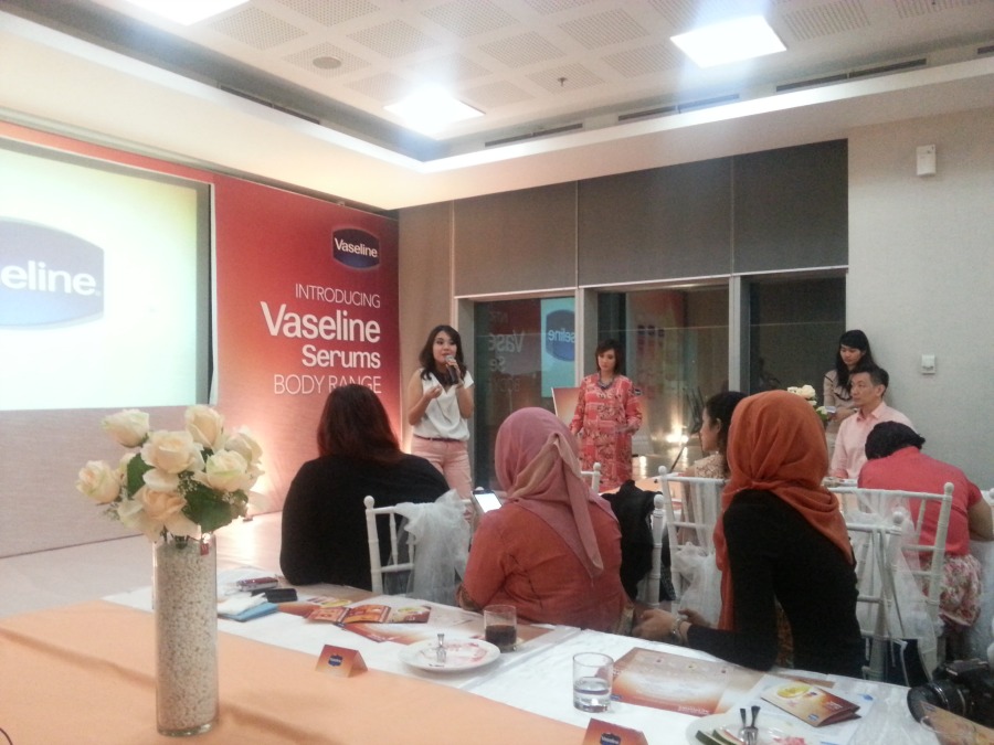 Nah, kemudian kami diperkenalkan dengan “Vaseline Body Serum”. Jujur, saya baru pertama kali dengar istilah body serum. Apa ya itu? Ternyata setelah diterangkan Mbak Hilda Kitty dari Vaseline, body serum itu istilahnya body lotion yang memiliki serum. Yang membedakan serum dari bahan lainnya, adalah dari “active ingredients”-nya, yang berarti, bahan-bahan di dalam serum ini bekerja lebih aktif, sehingga akan lebih efektif dan lebih cepat memperlihatkan hasil. Vaseline body serum sendiri ternyata memiliki tiga varian, dengan manfaat yang beda-beda.