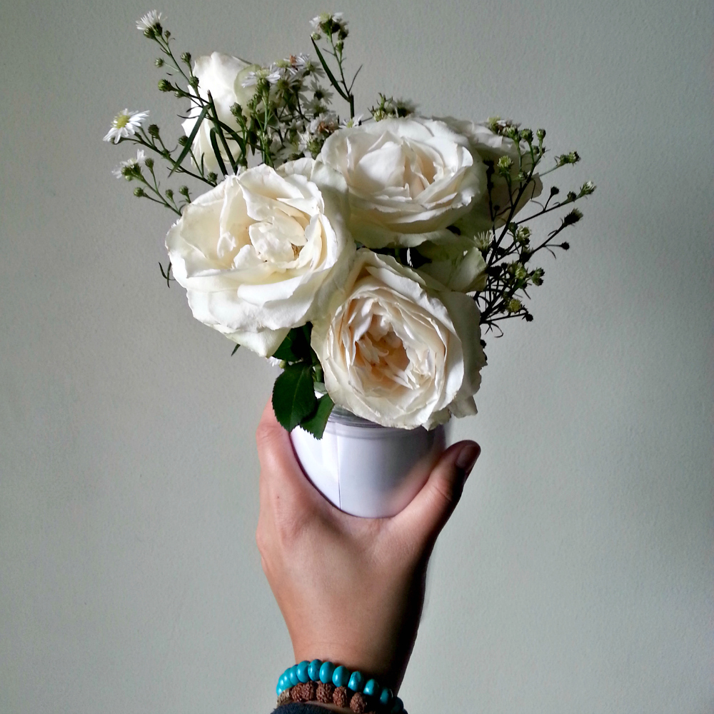 Bunga mawar putih! Iya pertama saya dibawakan sebuah buket bunga kecil (vas di atas tidak datang bareng ya, itu punya saya), lalu baru belakangan saya dikasih gelang biru hijau dan gelang kayu itu. Katanya itu batu turquoise, batu kelahiran saya. Bener gak, gak masalah sih, yang jelas saya senang menerimanya (meski sebenarnya berharap lebih).