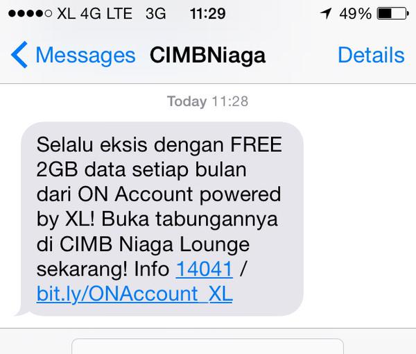Saya sempat bingung, bagaimana dengan saya yang sudah punya ON Account lama? Apa harus daftar ulang? Ternyata simple saja, saya cukup ke cabang CIMB Niaga atau datang ke Digital Lounge CIMB Niaga, lalu minta upgrade akun saya dari ON Account menjadi ON Account XL. Prosesnya cepat dan gak pakai lama kok, petugasnya cukup mengubah data saya di komputer, dan gak lama kemudian, saya dapat sms ucapan “Selamat Datang” di ON Account XL. Nice!